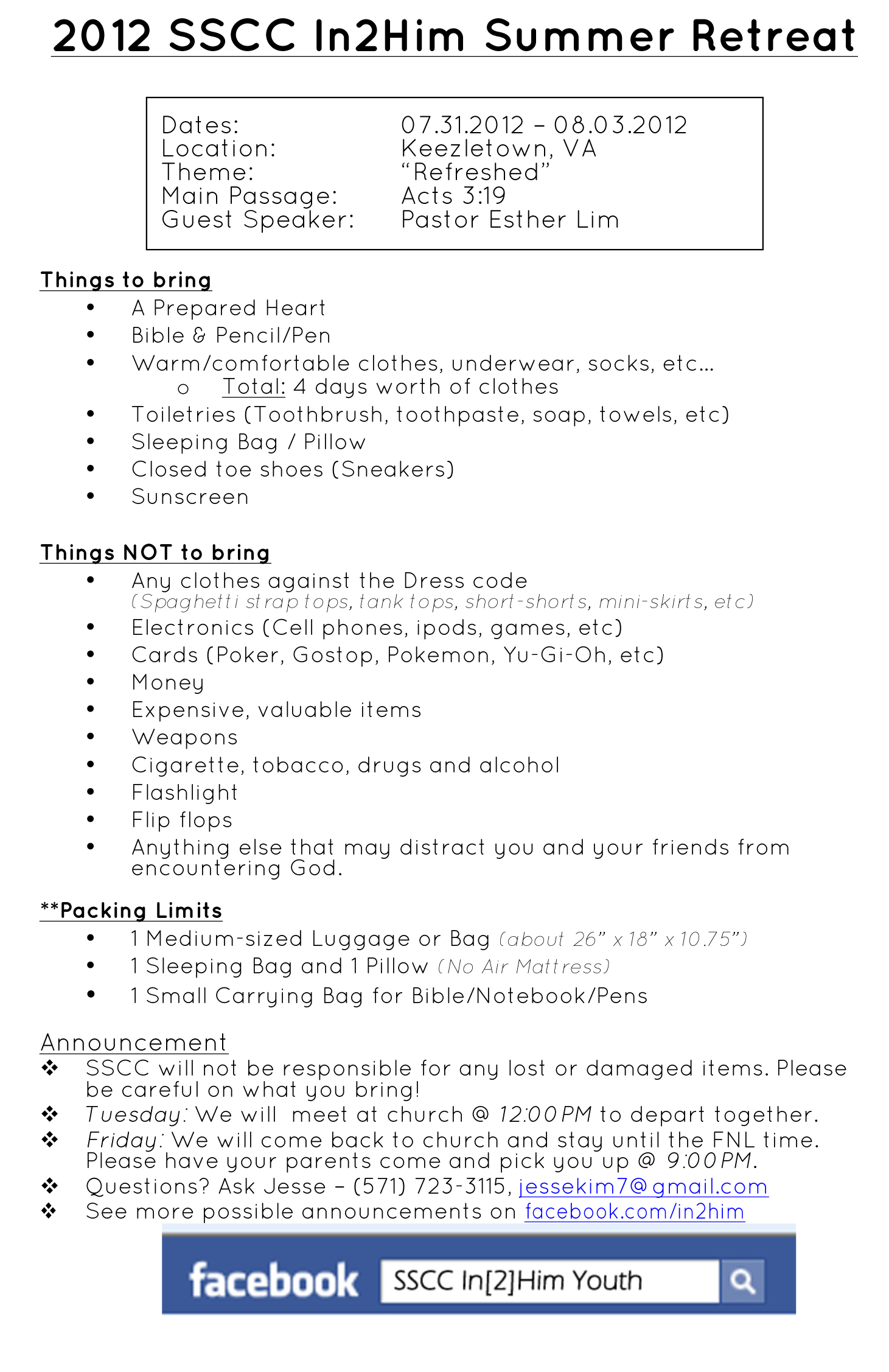 **금요일에는 교회에 미리 도착한 후 저녁식사과 더불어 다른 마무리 일정이 있습니다. 부모님들께서는 평소 금요모임(FNL)때와 같이 오후 9시에 학생들을 픽업하시면 됩니다.